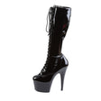 A knee-high lace-up boot in glossy black patent faux leather with a 7-inch stiletto heel and 2-inch platform. The lacing runs the full height for adjustable fit and visual impact, while a full-length inner side zip means you're not actually unlacing them every time.