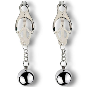 Clover-style nipple clamps in solid stainless steel with 50g ball weights attached. The clover mechanism means the more you pull or move, the tighter they grip - the weights add constant gentle tension that intensifies with movement.
