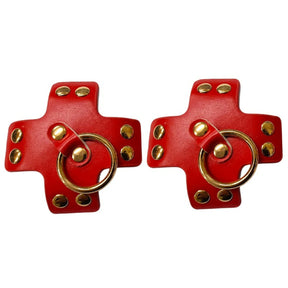 Cross-shaped nipple pasties in red faux leather with gold O-rings at the centre. They're self-adhesive, so you peel off the backing and stick them on - no fiddling with glue or clips.