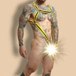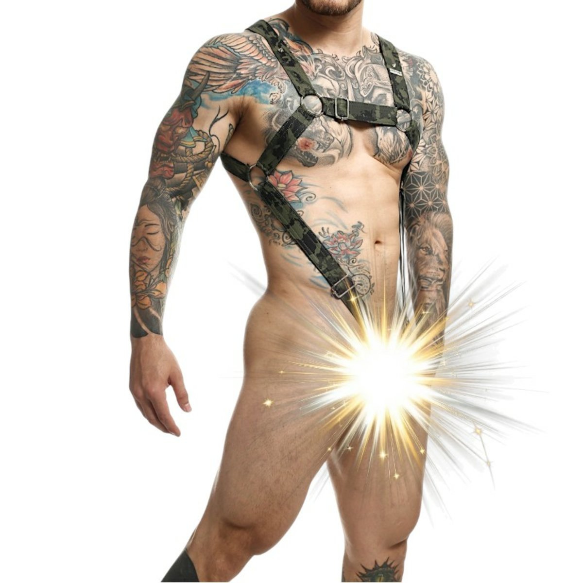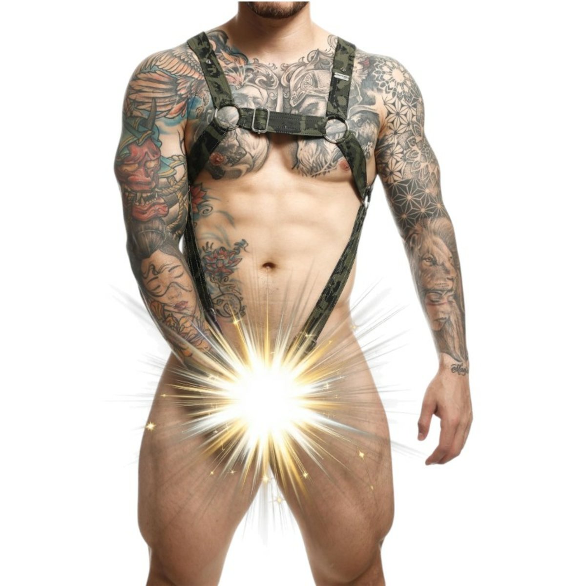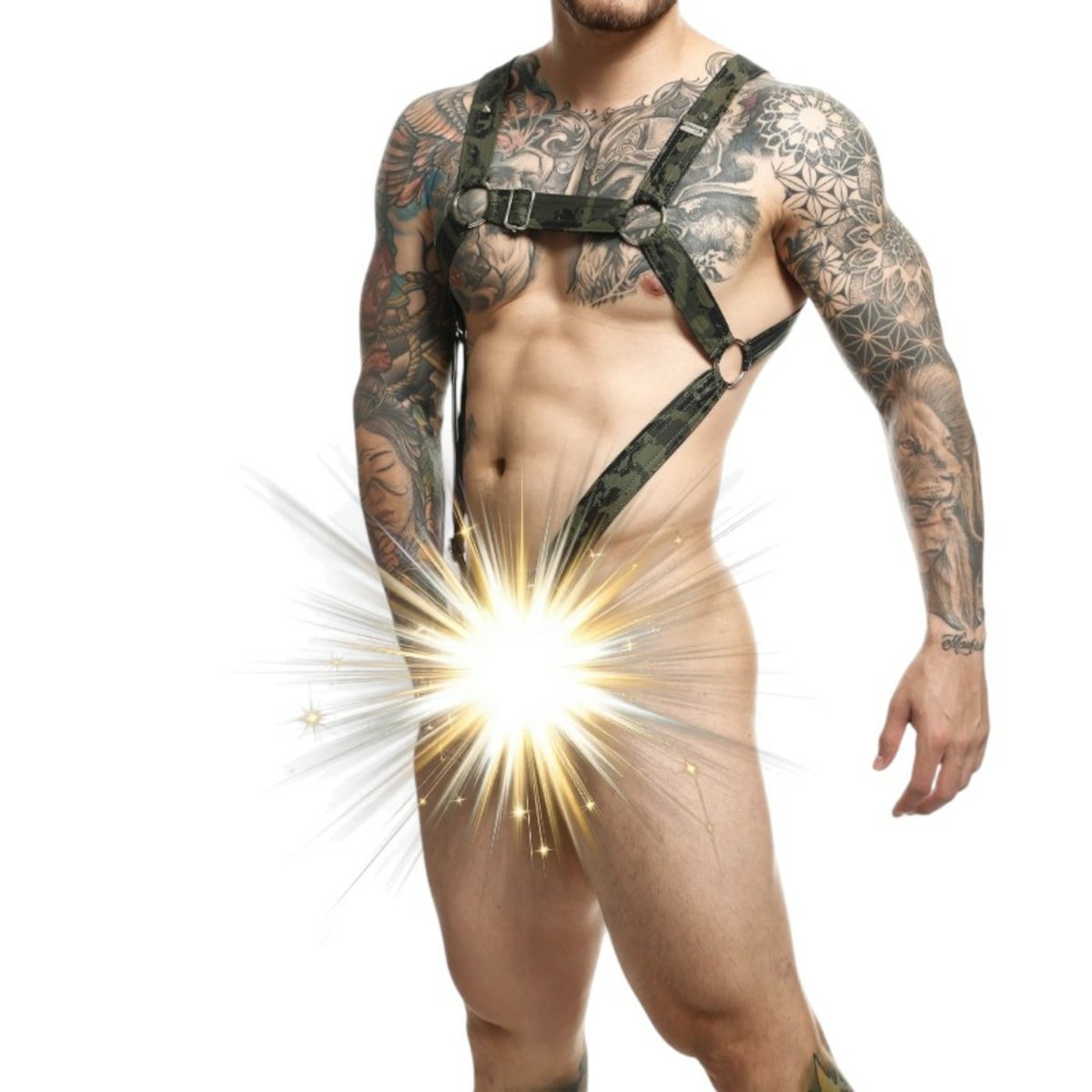 An H-front harness in green faux leather with a metal cock ring attached at the front. The straps are fully adjustable, so you can get the fit right whether you're wearing it over clothes or against skin.