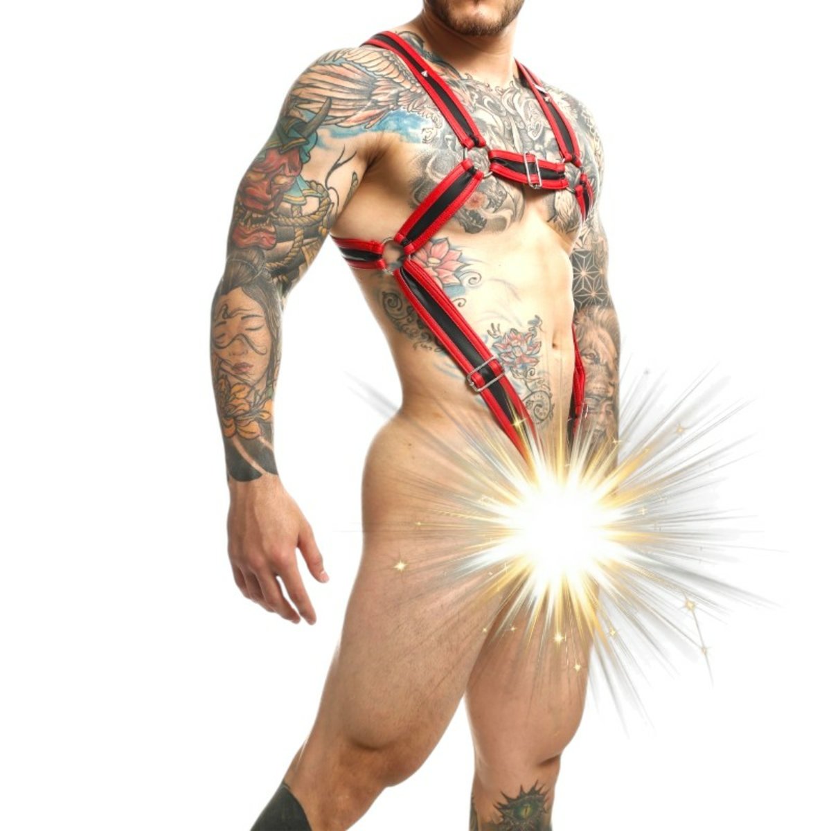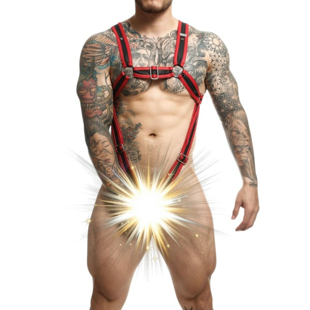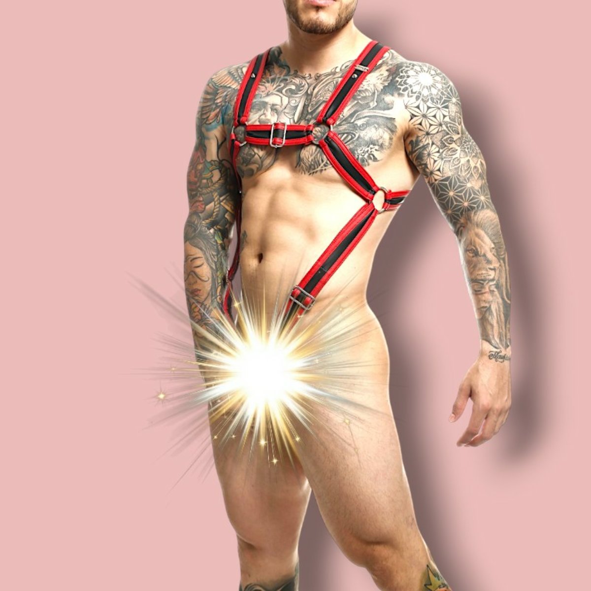 Adjustable faux leather H-front harness with an attached metal cock ring. One size fits most with fully adjustable straps.