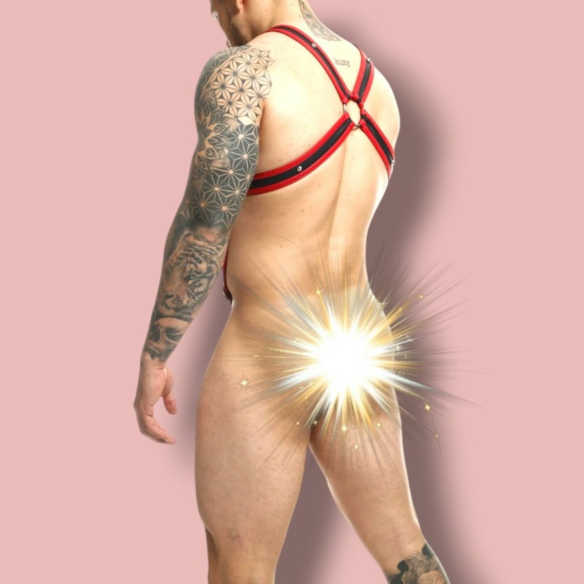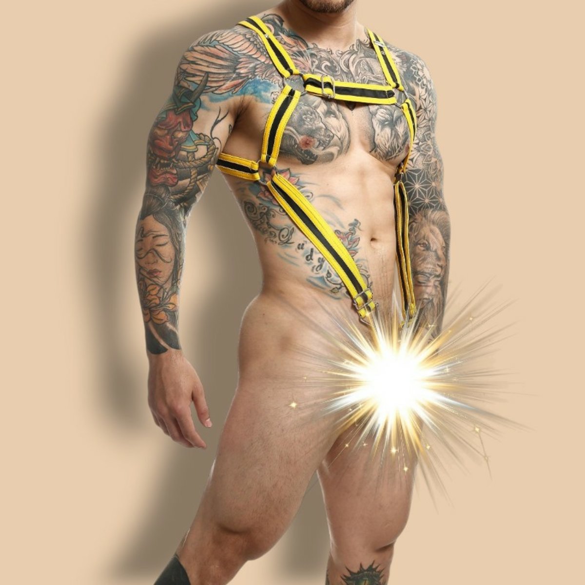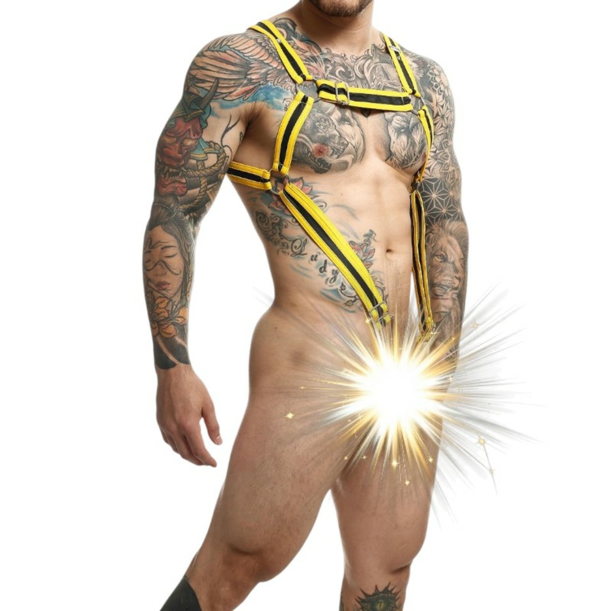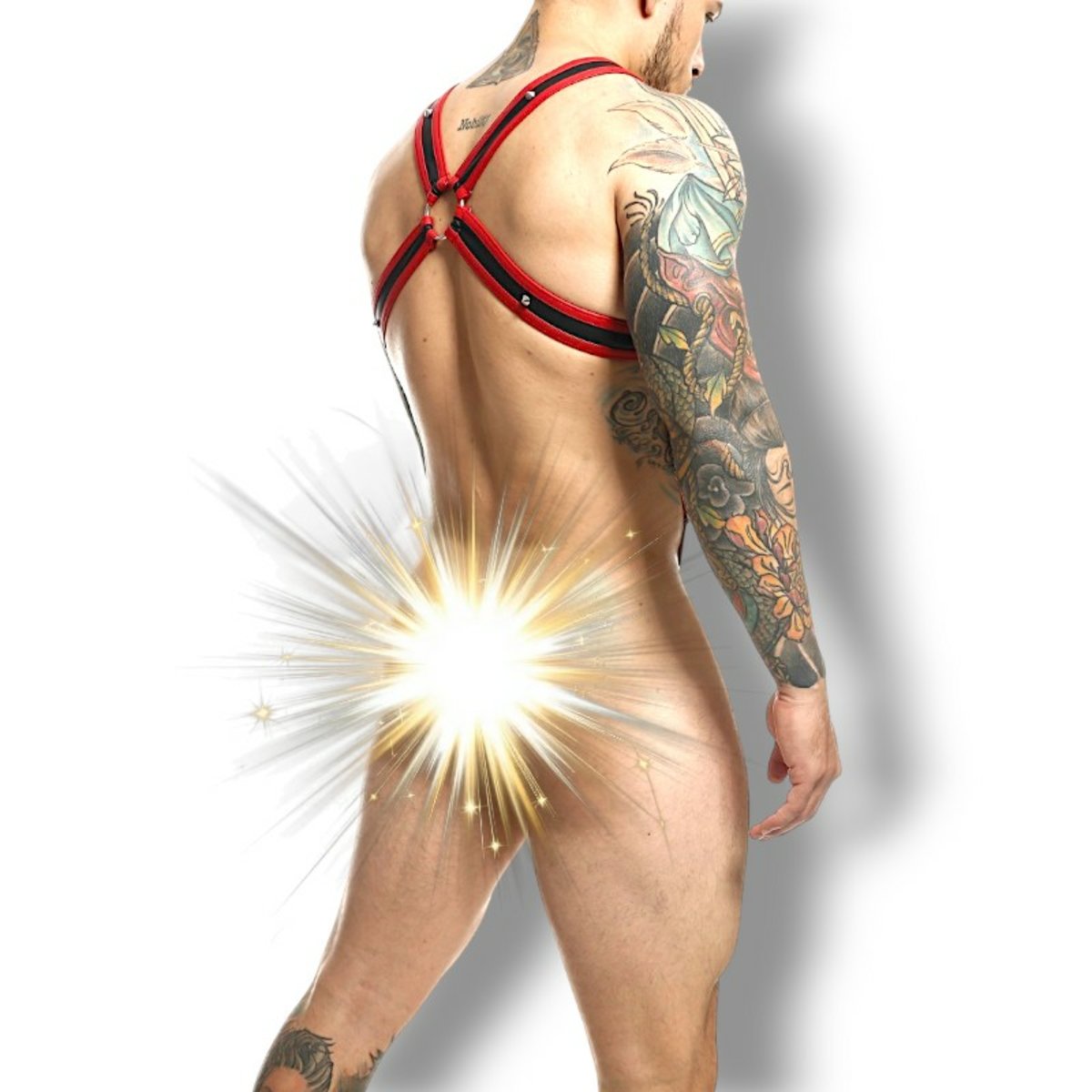 Adjustable faux leather H-front harness with an attached metal cock ring. One size fits most with fully adjustable straps.