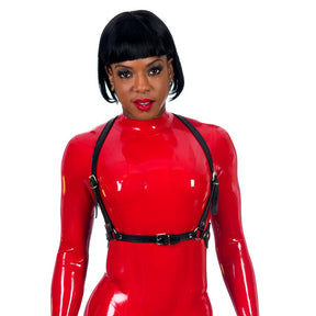 Classic black leather harness with large back central, O-ring and 2 handy D-rings at rear for bondage attachments. Three point fastening at front for easy access and flattering fit. Handcrafted by top UK leather artisan, Slap Leather. WARNING we do not recommend wearing with latex as metal may cause staining.