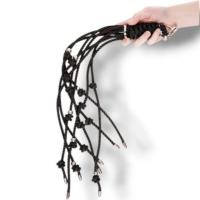 Eight-strand decorative whip inspired by traditional cat-o-nine-tails, tied with Shibari techniques. Polyester rope with stainless steel beads and metal hardware.