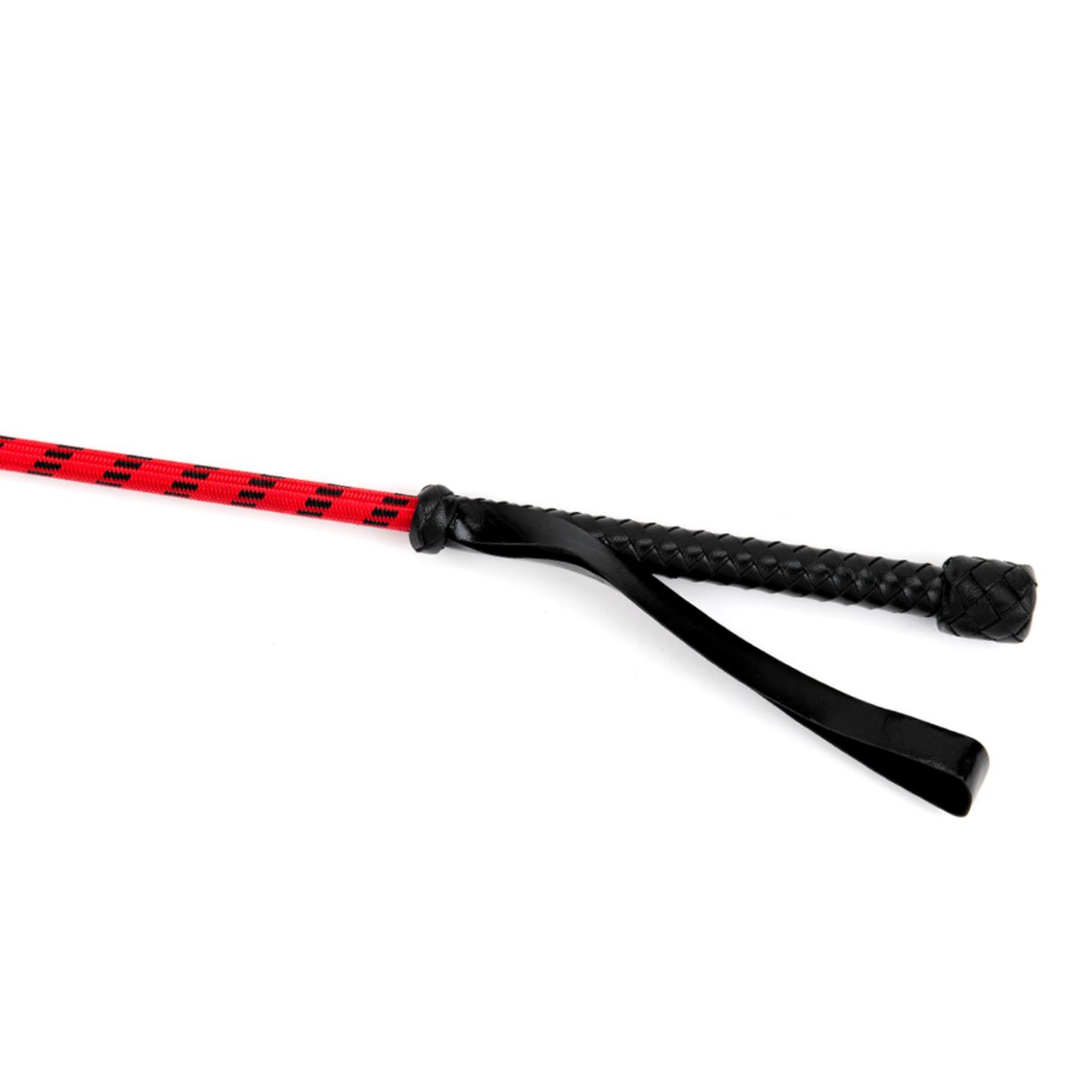 A riding crop in red leather with a black leather handle and wrist strap. The standout detail is the red and black leather heart keeper - a playful touch that sets this apart from standard crops.