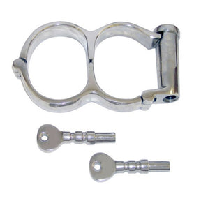 Irish 8 handcuffs in polished stainless steel that lock with a screw key rather than a standard cuff mechanism. The figure-8 design sits close to the wrists with a solid, secure feel.