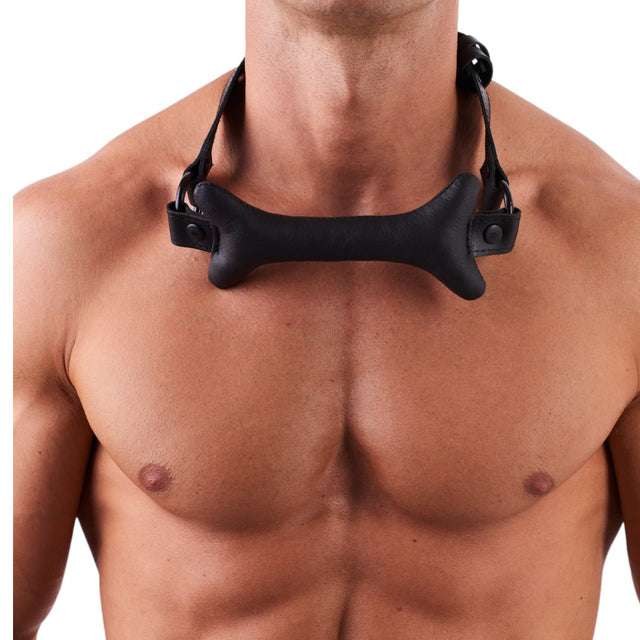 Leather bone gag with silicone wool filling for comfortable wear during puppy play. Adjustable strap fits 48-63cm with buckle fastening.