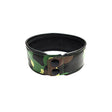 A leather arm band with army camouflage print. Double snap button closure.