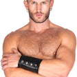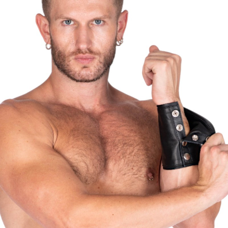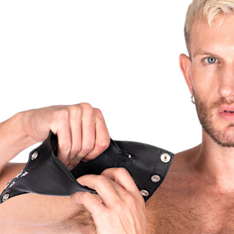 Leather gauntlet with contrasting trim and secreted inside pocket with zip closure. 4 silver press stud closures