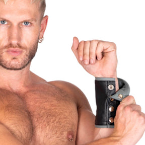 Leather gauntlet with contrasting trim and secreted inside pocket with zip closure. 4 silver press stud closures