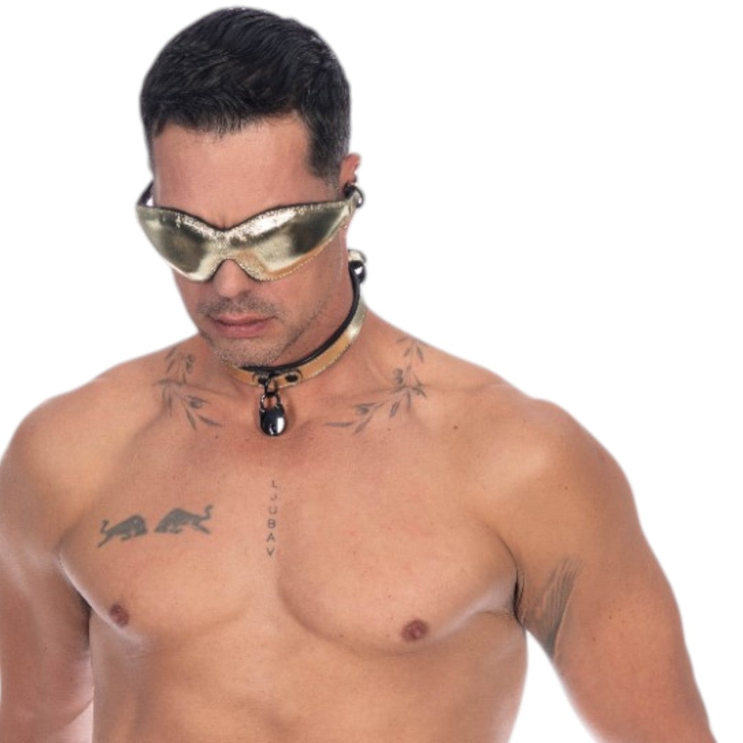 A 20mm collar in metallic leather with a leather lining that keeps it comfortable against skin. The padlock fastens at the front and comes with keys - you can remove it if you prefer a cleaner look, or keep it locked for non-removable wear.