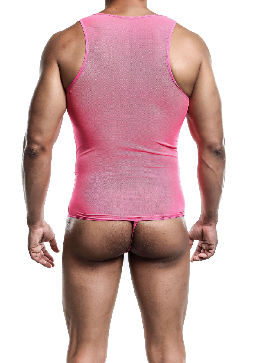 Sheer mesh bodysuit with a thong back and front opening. Stretchy nylon-spandex blend that moves with you.