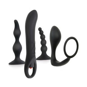 A complete prostate kit with four silicone toys that progress in size and intensity. Start with the gentle beaded design, move through the curved stimulator and cock ring combo, and work up to the vibrating massager when you're ready for more. Each piece has a suction cup base for hands-free positioning, and they're all fully waterproof.