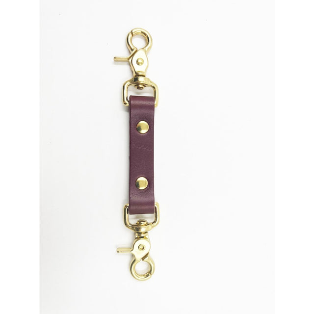 A short, sturdy leather strap with metal quick-release connectors at each end. Ideal for connecting wrist or ankle cuffs, or tethering your partner to fixed points during restraint play. The clips release quickly when needed, but hold securely during use.