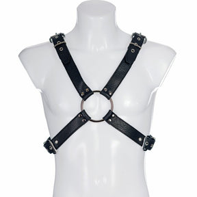 A classic leather chest harness with large O-rings positioned at the front and back, giving you attachment points for leads, chains, or other restraints. Four buckles let you adjust the straps to get the fit exactly right, and they make it easy to get in and out of.