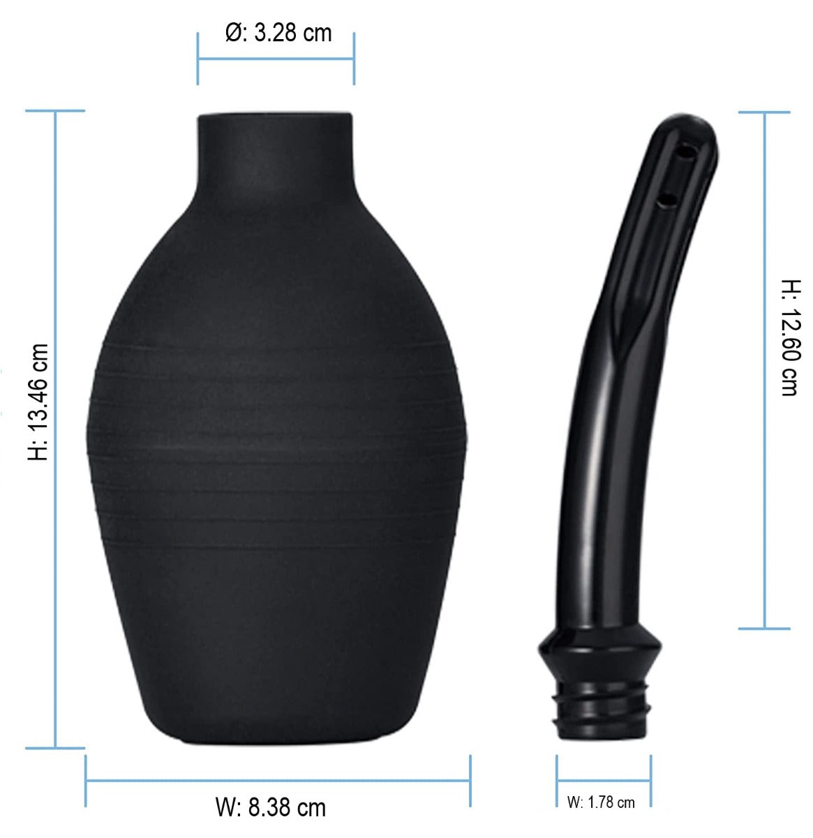 A silicone douche with a 300ml capacity bulb and a long, flexible nozzle that reaches 130mm. Eight angled spray jets distribute water evenly, and the soft tip makes insertion straightforward. Fill the bulb, screw in the nozzle, and squeeze.